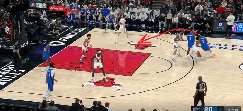 在队友持球突破时,即使不是战术重心,麦凯恩也具备很好的relocate(重新落位)意识,利用对位人有球端协防迅速移动至弧顶创造空位,肯威接球后得以迅速分球弧顶的麦凯恩轻松得到机会。