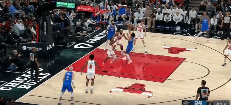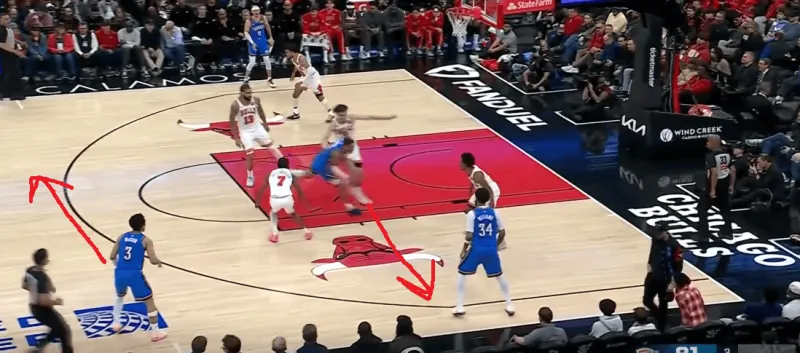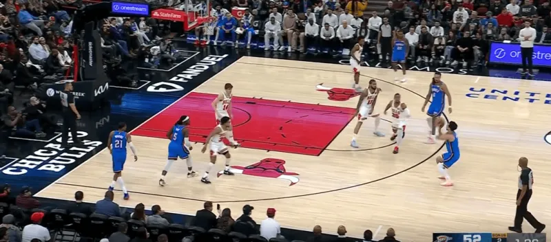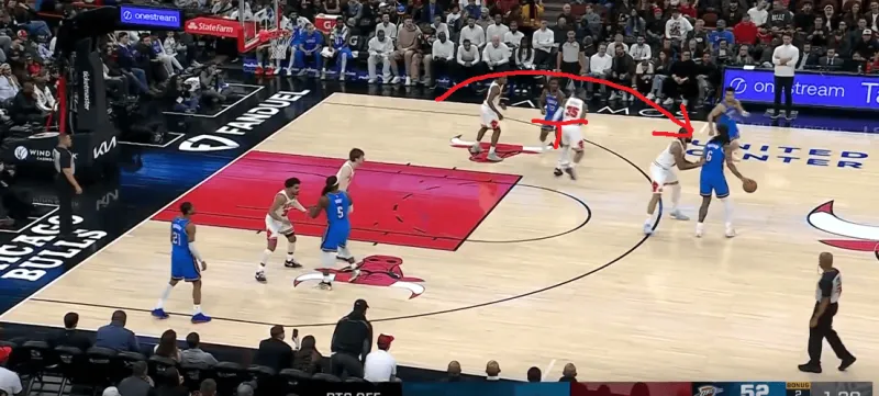 杰林-威廉姆斯弧顶策应时,麦凯恩跑动手递手迅速制造公牛的换防: