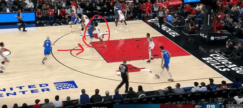 同样的战术发起下,麦凯恩的随机应变能力则让战术更加多变,正常来说借维金斯的掩护后要来到弧顶手递手,但麦凯恩利用吉迪和理查兹过去靠外的站位选择直接卷切: