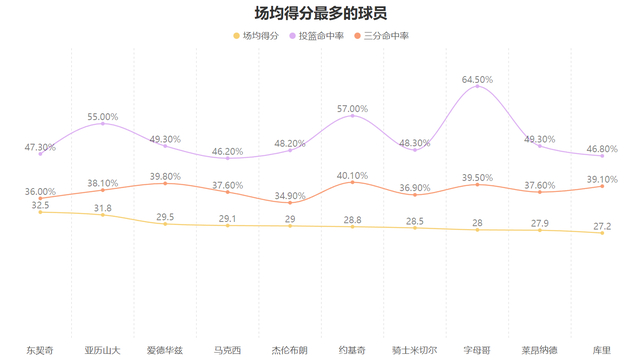 由于连续三节打卡出场时间不多东契奇的场均得分数出现了些许下降,但他依然以场均32.5分高居联盟第一,并且47.3%与36%的两项命中率虽然不算顶级但也是合格水准,而即使是这样的场均表现也是东契奇未尽全力的状态下打出的。