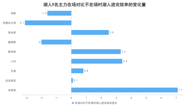 当东契奇在场对比不在场时,湖人的进攻效率从9名出场时间超过500分钟的主力球员中最低的111.6提升到最高的118.7,这意味着东契奇的在场可以令湖人每百回合的得分数从最低水准达到最高水准,湖人进攻的上下限均是由他来决定的。