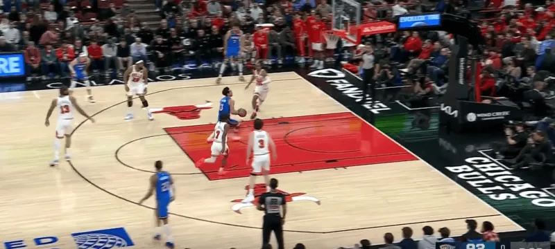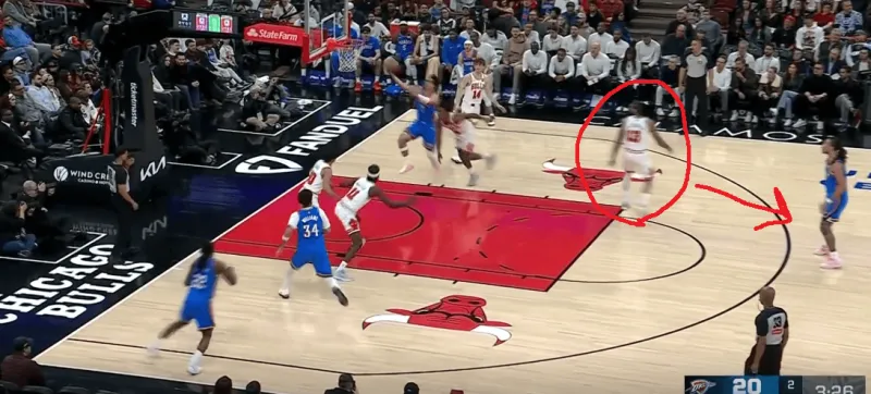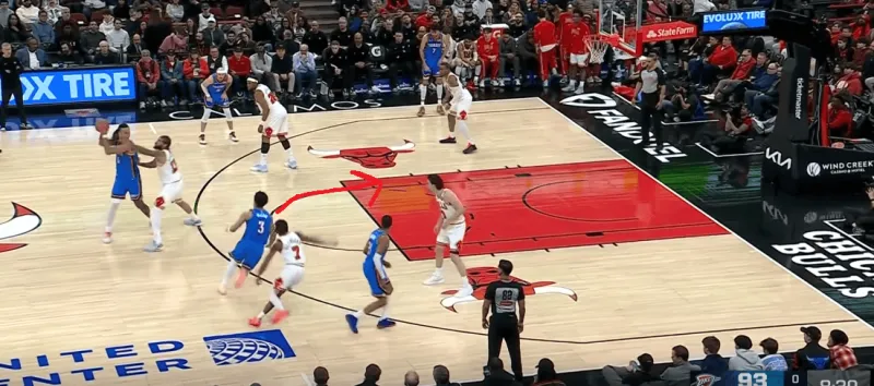 杰林-威廉姆斯弧顶策应时,麦凯恩跑动手递手迅速制造公牛的换防: